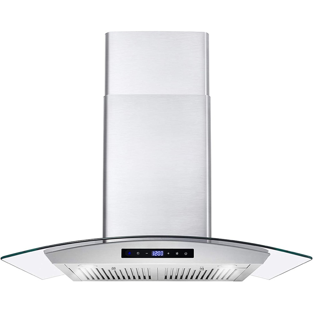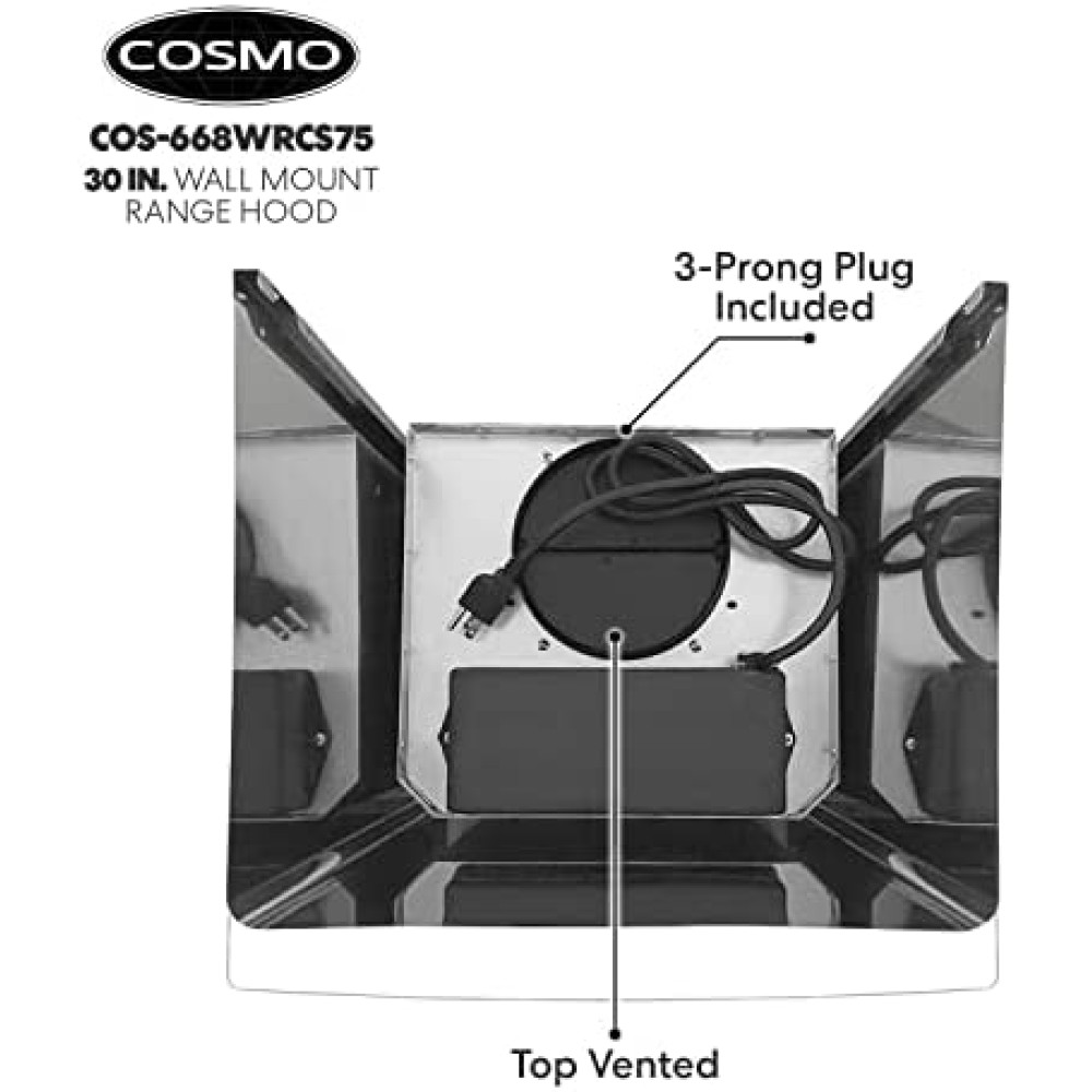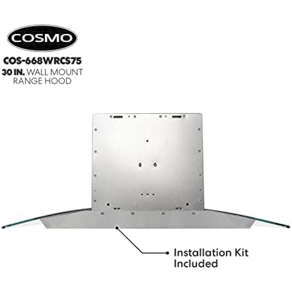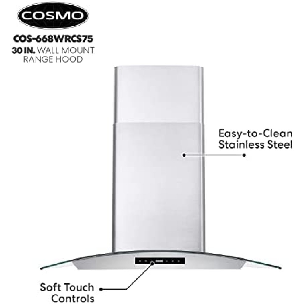 Cosmo?s COS-668WRCS75 combines curved glass and stainless steel the perfect centerpiece for any modern kitchen. The flowing designs of our 30? wall mount range hood come with an efficient 380 CFM centrifugal motor that traps smoke and fumes from lingering in your home. Cosmo Range Hoods include ARC-FLOW Permanent Filters that provide greater airflow and are dishwasher safe for easy clean-up. High-tech LCD touch control panel to manage multiple functions, including 3 fan speeds and LED lighting for added visibility.