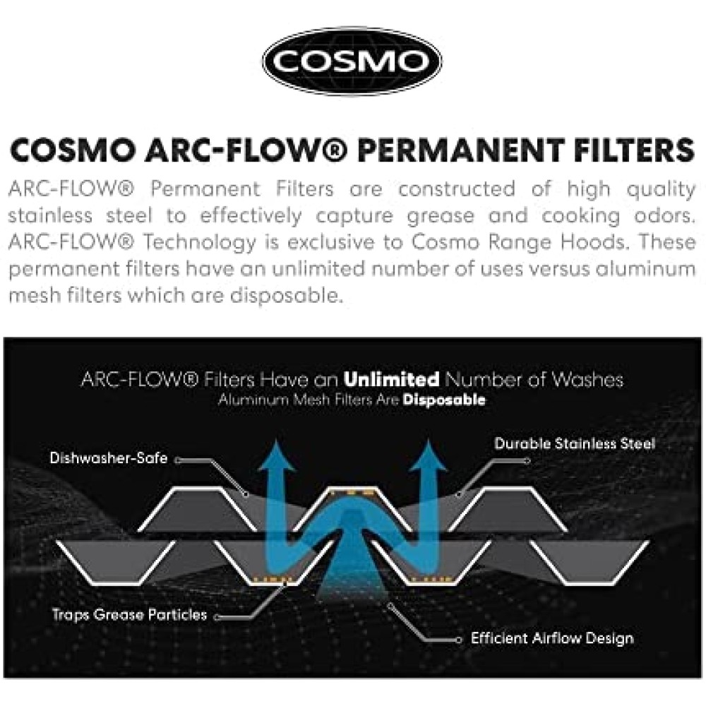 - EASY-TO-CLEAN FILTERS: Cosmo ARC-FLOW Permanent Filters are dishwasher-safe and extremely durable. No need to replace these filters, simply drop in the dishwasher for easy maintenance and cost savings